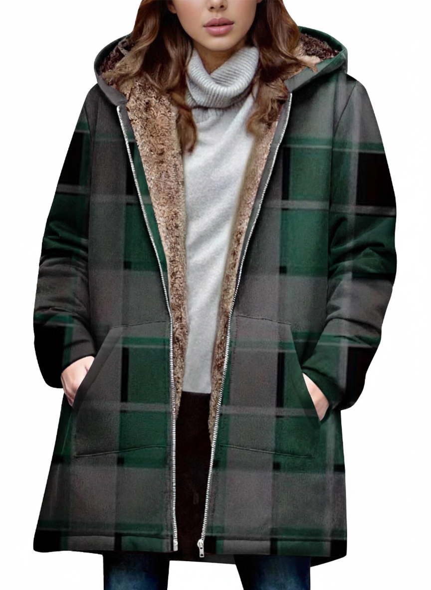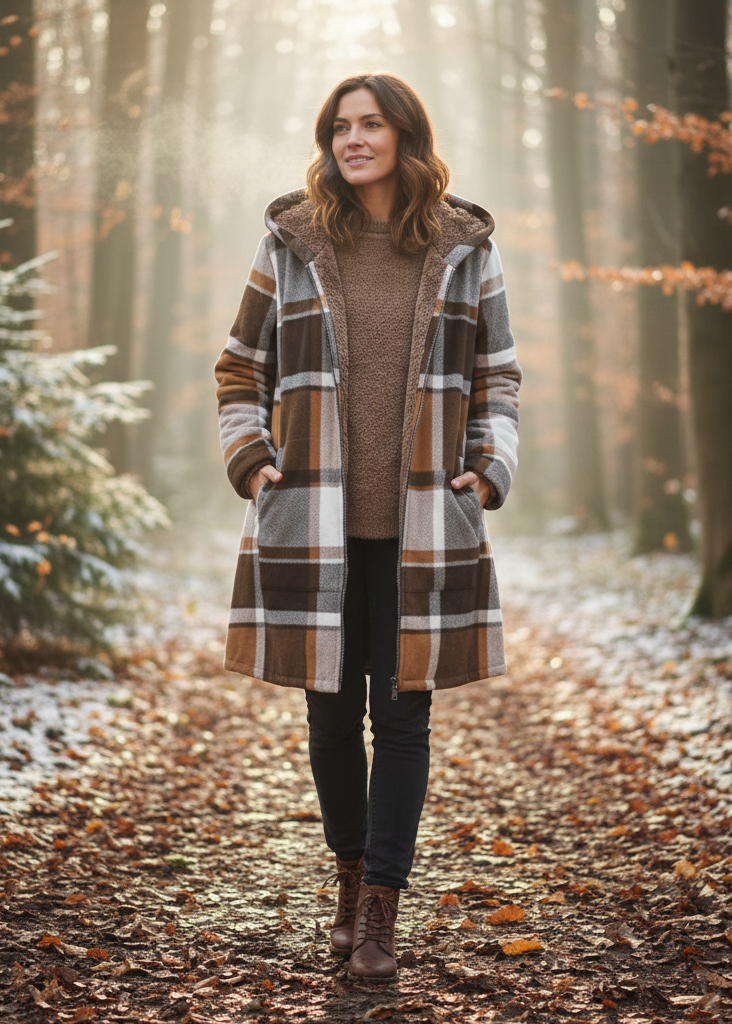 Discover the updated version of our jacket, now enhanced with an elegant checked pattern that adds a touch of modern character. Perfect for cool autumn and winter days, this piece combines a soft fleece lining, a practical zip fastening and a flattering cut, while adding subtle sophistication with its trendy outer print.